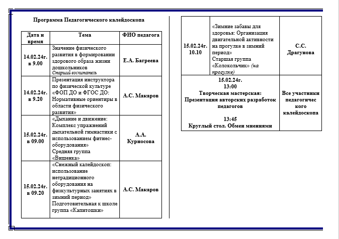 14 и 15 февраля 2024 г. в нашем саду состоялся Педагогический калейдоскоп: обмен опытом в области физического воспитания для педагогов ДОУ «Физкультурные занятия в ДОУ: планирование, организация и проведение с учетом ФГОС ДО и ФОП ДО». Педагоги представили собственный опыт в области физического развития.