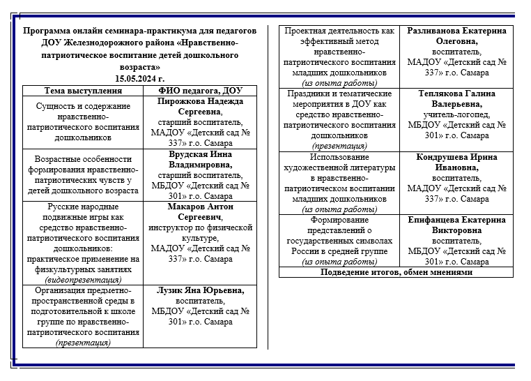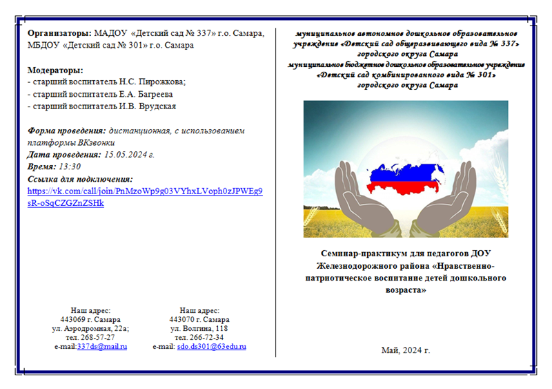 15.05.2024 г. состоялся районный онлайн семинар-практикум для педагогов МАДОУ «Детский сад № 337» г.о. Самара и МБДОУ «Детский сад № 301» г.о. Самара, на тему «Нравственно-патриотическое воспитание детей дошкольного возраста».