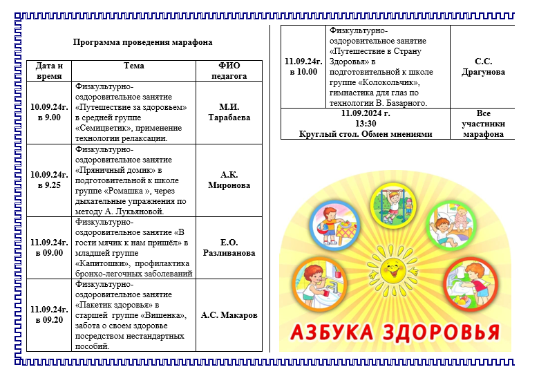 9 и 10 сентября 2024 г. в нашем саду прошел «Марафон открыты занятий для педагогов ДОУ «Занятия по физической культуре, через разнообразные формы физкультурно-оздоровительной работы»