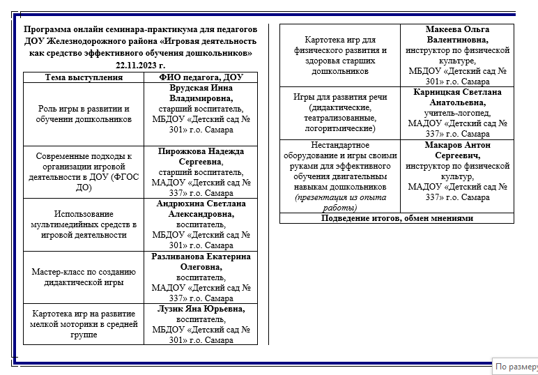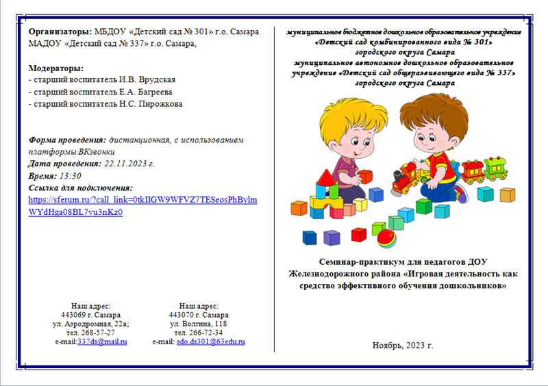 Районный семинар-практикум «Игровая деятельность как средство эффективного обучения дошкольников» проходил 22 ноября 2023 года для педагогов МБДОУ «Детский сад № 301» г.о Самара и МАДОУ «Детский сад № 337» г.о. Самара, семинар проходил онлайн на платформе ВКзвонки